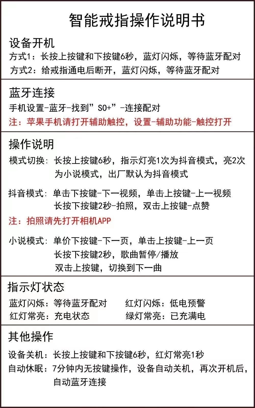 Smochm bluetooth smart ring for Tiktok remote controle connected with iPhonw Android operation guide: 1.connected: 2.operation: video guide smochm smart ring for Tiktok